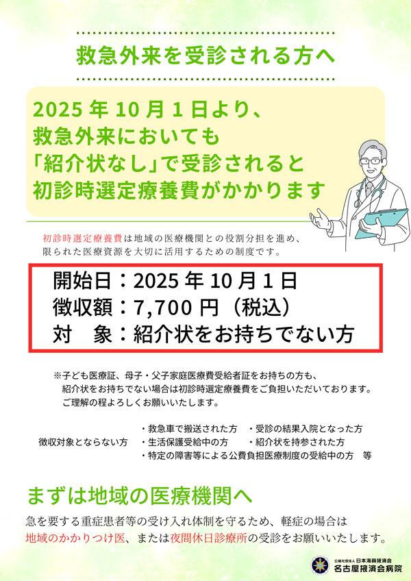 2025年10月1日より、救急外来において他の医療機関からの「紹介状」をお持ちでない初診の患者様は、診療費とは別に初診時選定療養費として7,700円(税込)、歯科の場合は5,500円(税込)をお支払いいただくことになります。